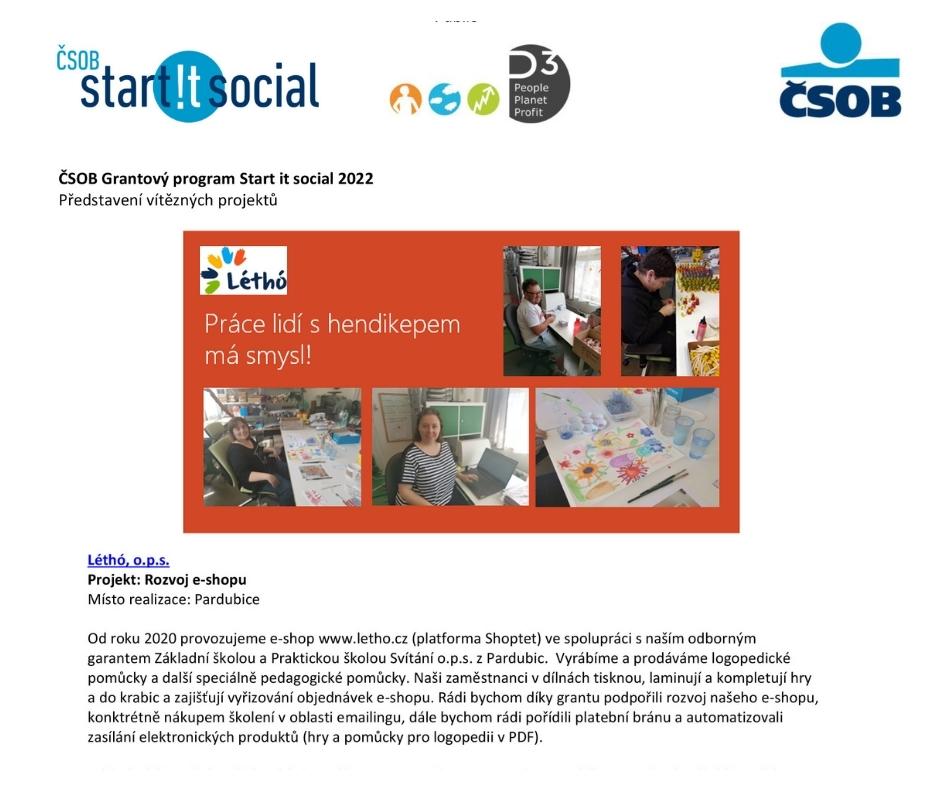 Moc si vážíme podpory nadace ČSOB start it social, že podpořil náš projekt rozvoje e-shopu. Díky, kterému budeme moci vylepšit funkčnost našeho webu. Vážíme si podpory. Práce lidí s hendikepem má smysl.